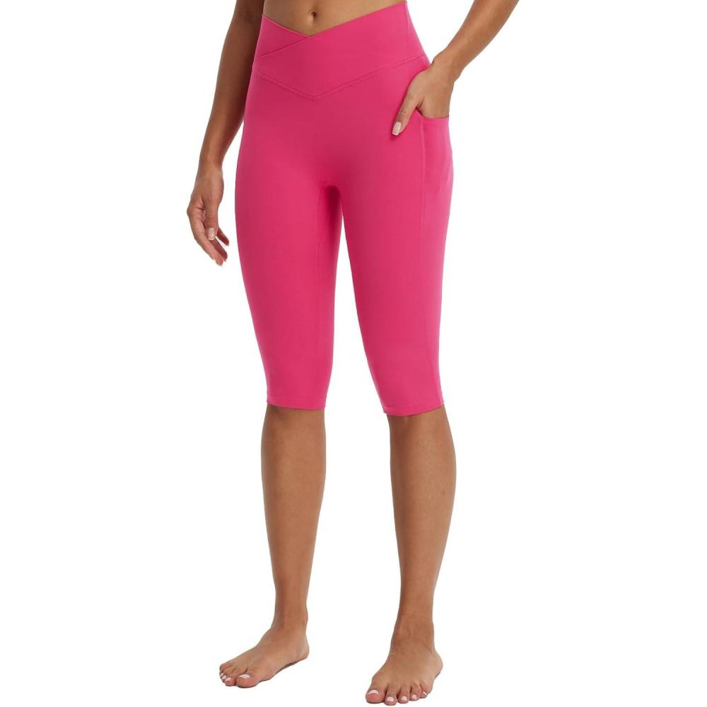 baleaf Capri Leggings for Women Knee Length Yoga Workout Capirs Leggings with Pockets Tummy Control Stretch(Rosy)