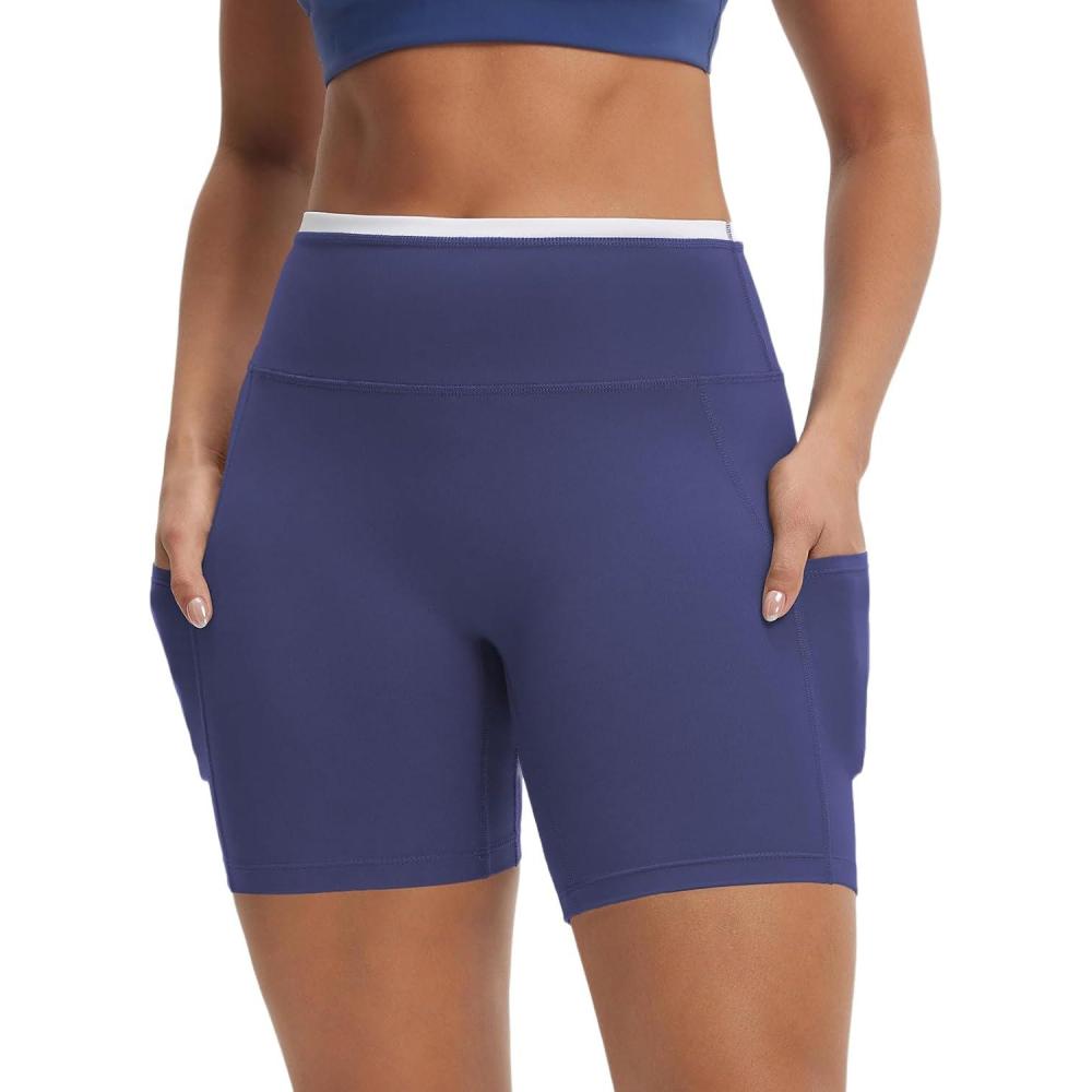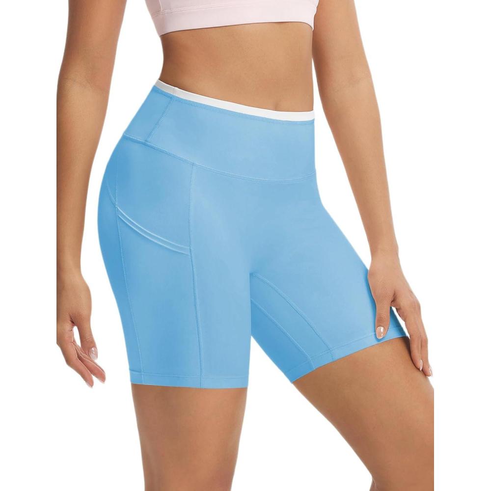 baleaf Biker Shorts for Women High Waist Tummy Control with Pockets Yoga Workout Gym Bike Shorts No Front Seam(Blue/White)