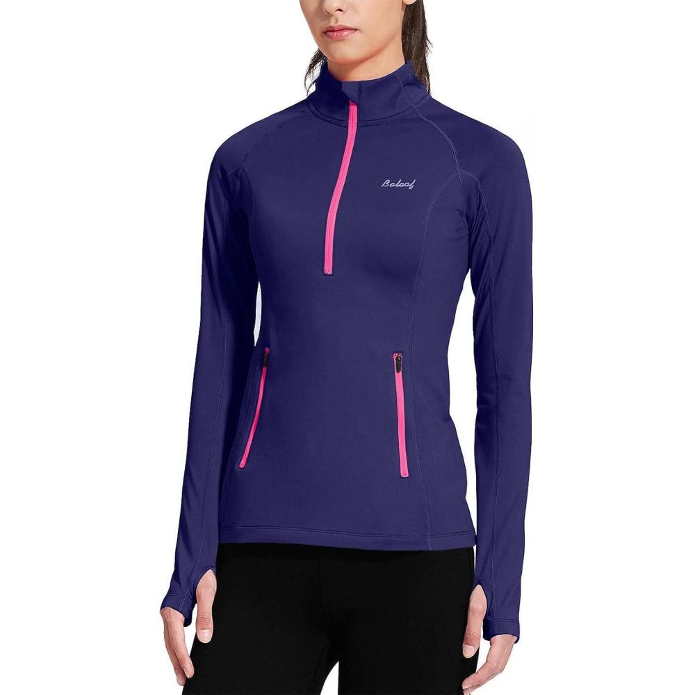 baleaf Women’s Running Jacket Thermal Fleece Pullover Half Zip Tops Thumbholes Winter Long Sleeve Cold Weather(Navy)